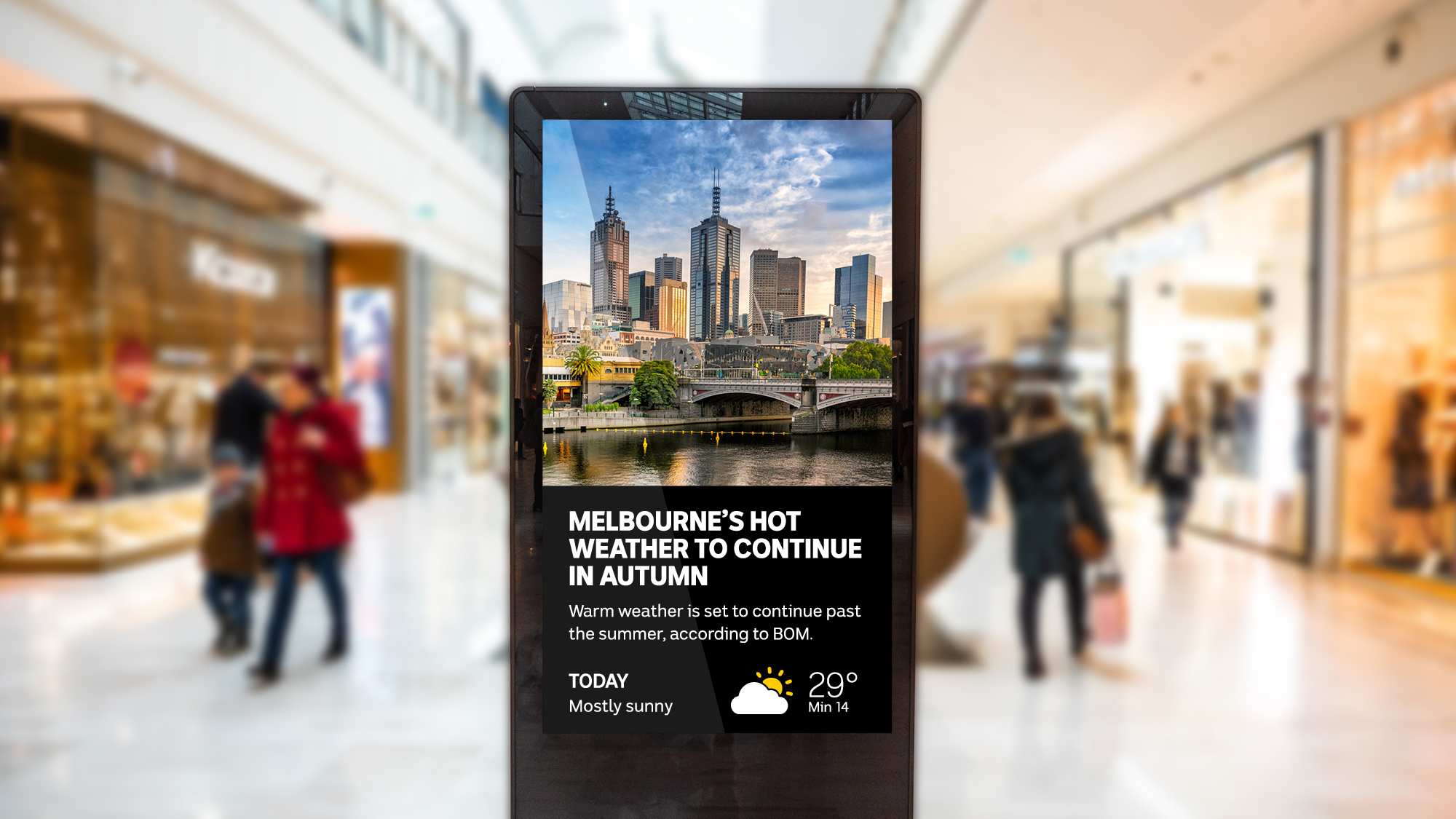 News Syndication helps clients increase their out-of-home screen ‘dwell time’ by delivering trusted news in various formats, from 15 second news videos to bulletins, text & image, and ticker feeds. News can be customised for any size screen in any location.